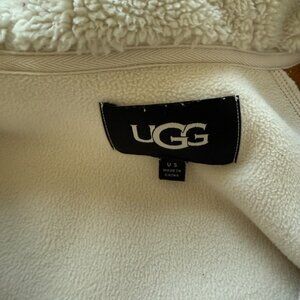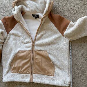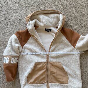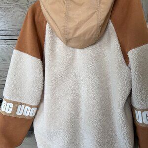 Sporty and stylish full-zip Carrabella UGGfluff hooded jacket in neutral colors. Carrabella is crafted with blocks of UGGfluff plush fleece, sweatshirt-fleece material, and nylon for a textured look. Graphic UGG Font logo borders the cuffs on each sleeve for a fashionable look.
