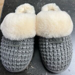 UGG slippers with a charcoal knit design. Features soft ivory lining for added comfort.