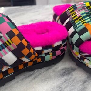 Vibrant UGG slippers with a striking multicolor design. Features a plush pink interior for ultimate comfort. Great condition