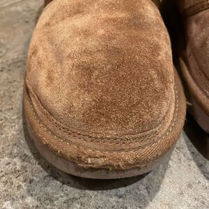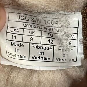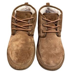 Chestnut, tan, brown, Neumel chukka, suede leather, lace up boots by UGG in a women's size 11 and EU 42. Insoles lined in UGGplush cream colored wool which has signs of use but has fluff. Uppers are very clean with some minor signs of wear. The cording on the right shoe is scuffed at the toe. The soles are very clean with no wear. These are very comfortable, winter shoes. Overall in very good pre-owned condition with signs of wear from normal to light use.