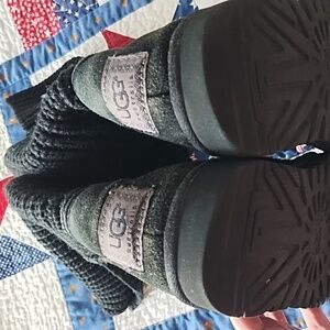 UGG Classic Cardy Boot size 8, Black ,Button Classic silhouette is recast in a warm, chunky sweater knit that's convertible based on your mood – pull all the way up the calf, slouch it down a bit, or fold all the way over for a shorter style. Three large buttons decorate the top of the shaft and three smaller ones appear when the boot is cuffed. The Cardy is lined with a plush wool insole, while our signature lightweight sole provides cushioning, traction, and durability. Pair these boots with slim pants and a leather jacket for weekend events.