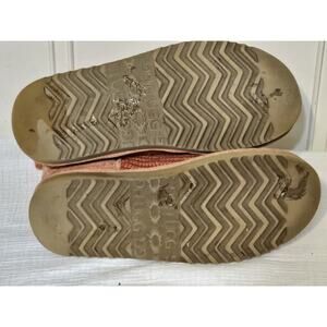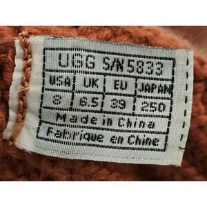 The UGG Classic Cardy Mid Calf Knit Crochet Boots in size 8 are a stylish and comfortable option for women. These boots feature a cozy sheepskin footbed, perfect for casual occasions. The mid-calf shaft and round toe shape make them versatile for everyday wear, while the low heel and slip-on style ensure easy comfort. The orange color and crochet accents add a unique touch to this vintage-inspired UGG style. Made with a textile upper and foam outsole, these boots are both fashionable and practical, offering cushioned and comfortable support for all-day wear.