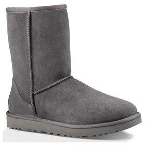 Classic profile gray UGGs with sheepskin lining. Suede upper and rubber sole. Some mild wear, as seen in pictures. Otherwise in good condition.