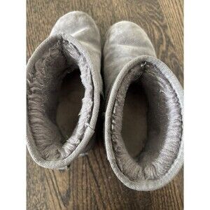 The UGG Classic Mini Boot with Logo for Women in size 10, in a stylish gray color, is a comfortable and versatile bootie perfect for casual occasions. Featuring a round toe shape, pull-on closure, and a flat heel, these boots are lined with cozy sheepskin and sport a shearling fabric type. The ankle shaft style and classic UGG branding make these boots a must-have for the winter, fall, and spring seasons. Made from high-quality leather and featuring a regular calf width, these UGG boots are a timeless addition to any woman's shoe collection. In good used condition. Please see all pictures for detail.