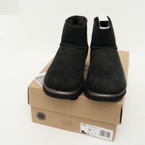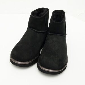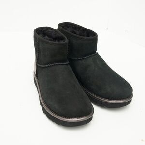 UGG Classic Mini Shine Boots featuring a metallic heel counter and leather binding for a subtle shimmer. Crafted from sheepskin with a plush insole made of 80% upcycled wool and 20% lyocell for signature softness. The lightweight outsole provides all-day cushion and grip. Details include a metallic heel accent, rear pull tab, and leather heel label with embossed logo.