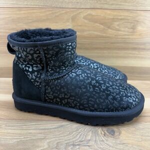 UGG Classic Mini Snow Leopard Womens 7 Black Suede Shearling Fur Lined Boots