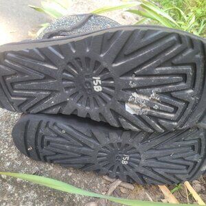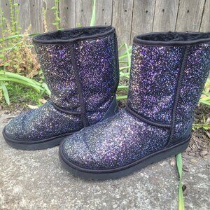 These sparkly UGG Classic Short boots are in excellent used condition. Only issue I want to note is that they originally came from a smoking home and have a faint smoke odor. I worked hard on deodorizing them by airing them out in the sun for many days and feel they now are almost odor free. You will only notice the odor if you are very sensitive to smells and deeply sniff the interior. Other than the faint smoke smell they are in perfect condition and a gorgeous pair of genuine UGG boots!