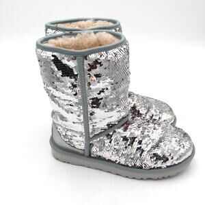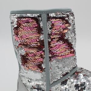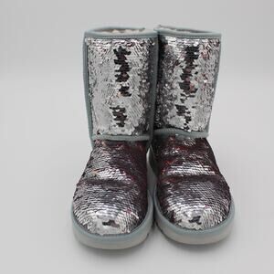 UGG Classic Short Sparkles Sequin Boots Womens Size 7 Silver Pink Shearling