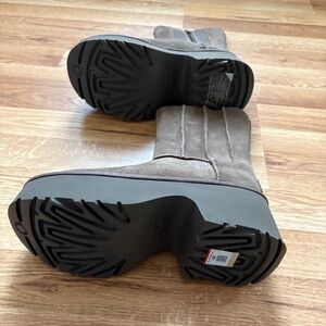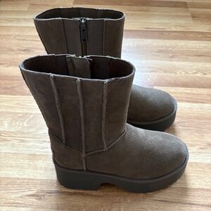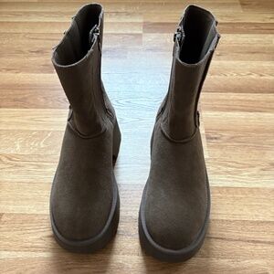 New without tags. Never worn. UGG Classic Twin Seam New Heights Suede Boots. Color is Hickory. Size 8. Suede upper with EVA sole. Side zipper closure. Faux fur UGGplush ™ footbed and lining. Foam footbed. UGG ® logo embossed suede heel label