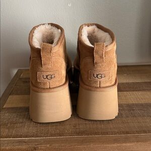 UGG platform ankle boots in chestnut. Warm lining and sturdy sole. With a chunky notched platform and a 3" heel. Never worn. No longer have the original box.