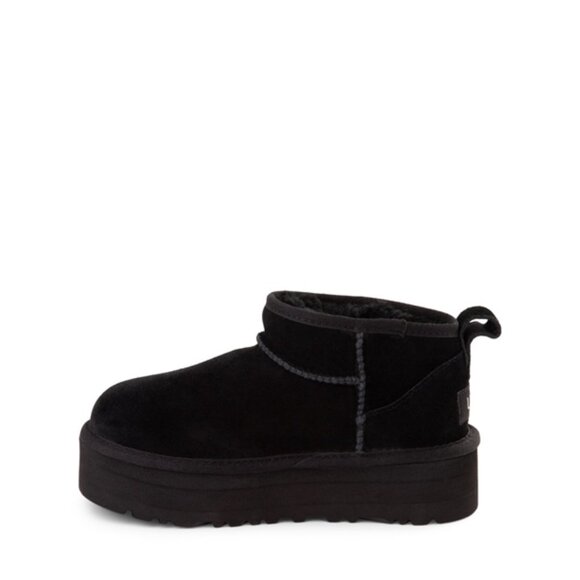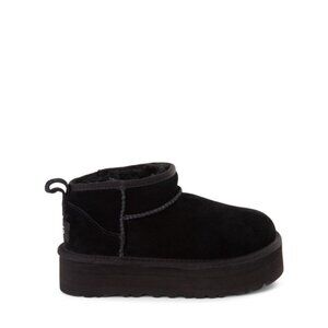 Our ever-popular Women's Classic Ultra Mini Platform is now available in a mini size. This smaller version is designed with the same level of unbelievable coziness, signature Twin Seams and a platform base. Fully lined with our ultra-soft UGGplush™ wool blend and complete with a soft suede upper, the Classic Ultra Mini Platform gives little feet the true feeling of UGG®. A rear pull tab makes it easier for kids to pull these on, so you can slip into your matching pair at the same time. Features. • Best for: Casual. • Suede upper. • Rear pull tab, Overlock stitch detailing on seams, Asymmetrical topline. • Foam footbed. • EVA midsole. • Sugarcane EVA outsole. • Woven heel label with UGG® logo. • Recycled Materials. • Crafted With Preferred Materials. Materials. • Lining/Insole: 17mm UGGplush™ 60% Upcycled Wool, 40% Tencel™ Lyocell. • Textile binding made from 100% Recycled Polyester fibers. Specifications. • Heel Height: 1.5"/3.8cm. Size : 13 US , 12 UK