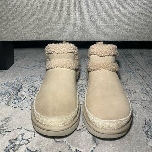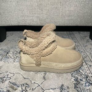 Streams of thick, curly genuine shearling trace the contours of a fan-favorite bootie that's made of mixed-finish suedes and styled with a lower profile for easy-on/easy-off wearing. It's lined with cushy, warm UGGplush, a moisture-wicking textile made from a wool-rich blend but crafted to feel and wear like genuine shearling.