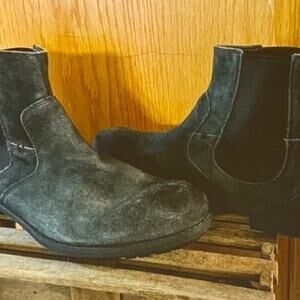 UGG CLYNE Black suede boot has style with many outfits. It has a rubber sole with a shaft height of approximately 5 1/2 inches, also has pull up tabs. Size 12