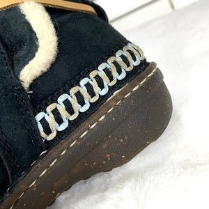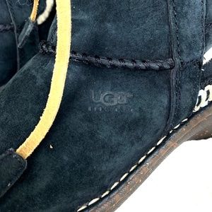 Stylish UGG winter boots. Black leather/suede outer with tan leather wraparound laces, sheepskin and leather lining. Rubber soles. Cozy and warm design. Bought new and worn less than half a dozen times, in excellent condition with only flaw being a couple of lint pieces on interior lining.