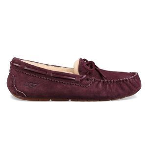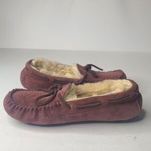 UGG port purple suede slippers with sheepskin lining and tie around front. Whip stitching detail and rubber outsole. Excellent condition