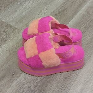 Colorful fluffy Disco Platform sandals by UGG. Features bold pink and orange design. Excellent condition. Size: 7.