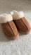 UGG slippers with soft brown suede. Cream plush lining for warmth.