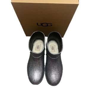 Features: Slip on ankle style. Waterproof. One piece injection uppers. Synthetic, Glitter infused PVC upper. 60% upcycled wool, 40% lyocell insole. Midsole made with recycled EVA regrind. Glitter inflused PVC outsole. UGG logo woven label on sockliner. Best for heavy rain. 10.5" shaft Circumference.