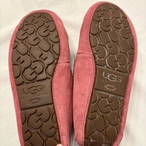 Classic soft suede moccasins in a fun vibrant color. Nothing beats UGG plush lining! Water-resistant. Features bow detail. Like new, only worn once and too small. Fit like a 7.5!