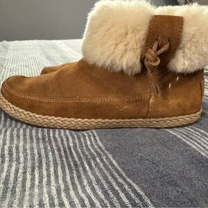 UGG Elowen Moccasin Booties Zip Flat Ankle Boots Chestnut Suede Fur Trim US siz9