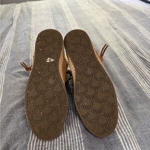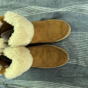 Experience warmth with UGG shearling slippers. Tan suede with cream fur lining. Ideal for cozy comfort.