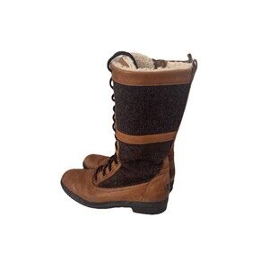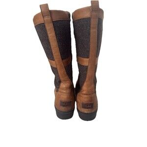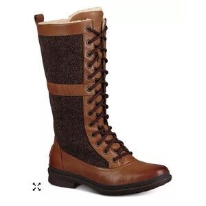 The UGG Elvia Boots in Women's Size 9 Tall Chestnut are stylish and functional footwear perfect for the colder months. Made with waterproof leather and lined with cozy sheepskin, these lace-up boots feature a side zip closure for easy wear. The low heel and solid brown color make them versatile for various outfits, while the UGG brand ensures high quality and durability. These snow boots are crafted in Australia, making them a standout addition to any winter wardrobe.
