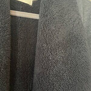 UGG women's Faux Shearling Wrap, size small. Open front fleece jacket. Medium grey exterior with slightly darker faux sherpa lining. Gently worn, in good used condition. There are a couple marks, one on the front "shawl" part of the interior lining, and one on the sleeve. See photos.