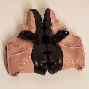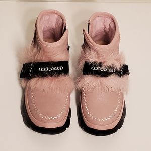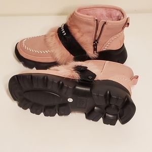 PINK & BLACK adorable sneaker-style ankle booties by UGG Australia. Chunky sole for max foot support, elegant & practical but not bulky. Zipper closure, strap embellished with fluffy longhair sheepskin. Feels like stepping on clouds! Lined & padded with the ultra soft UGGpure (a moisture-wicking, shearling-like textile made entirely from wool), this boot is luxurious from inside out! Pair with denim or anything colorful, or turn it up a notch with a miniskirt and chucky sweater!