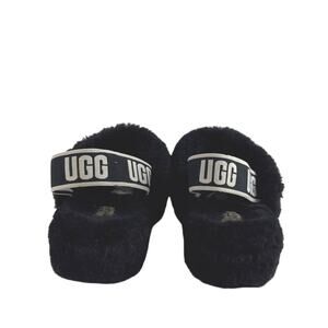 UGG Fluff Yeah Black Faux Fur Strap Logo Slingback Slippers Slides Sandals Size 6
