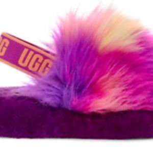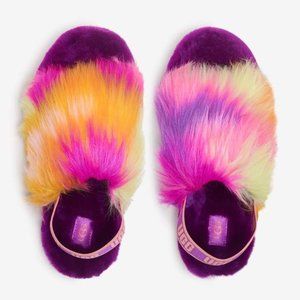 This fluff has the stuff—it's the new Fluff Yeah Slide Sandal from UGG®! Updated with a summery tie-dye print, these cozy slippers feature 40mm faux shearling uppers with a soft fleece lining, elastic heel strap for a secure fit, and molded rubber outsole for traction.