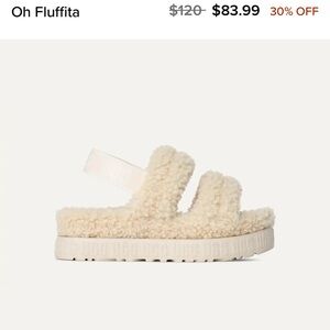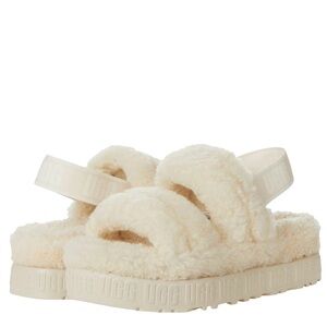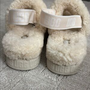 Soft and stylish UGG slides in a fluffy cream shade. Ideal for cozy wear. Still on Ugg.com for $84 !!On left shoe the fur is rubbed off under the toe does not show when shoe is on. Please see photos! Other than that imperfection, they are like new.