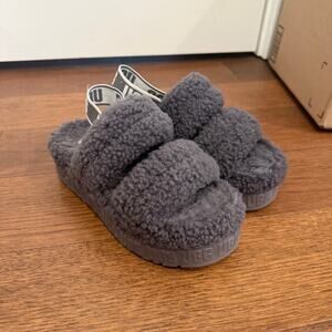 Soft and fluffy UGG platform sandals in a charcoal shade. Ideal for casual outings.