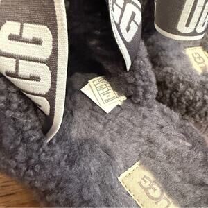 Soft and fluffy UGG platform sandals in a charcoal shade. Ideal for casual outings.