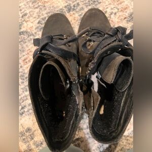 With water-resistant leather and lots of metal hardwear, this boot has a tough exterior but a soft interior, lined with plush and warming sheepskin. Pair with your favorite jeans and an oversized sweater. -Water-resistant leather Non-functional leather straps with metal buckles Metal eyestays Medial zipper Sheepskin lining Cushioning PORON® and foam with leather lining Leather welt Heel wrapped with stacked leather Molded rubber outsole