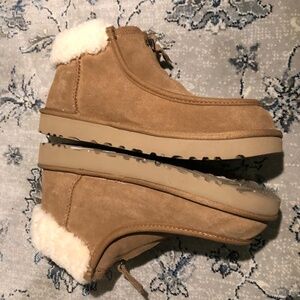 The look of a shoe and the teel of a slipper. You'll love the Funkarra's wearing opportunities from the living room to the grocery store. Our beloved soft suede upper pairs with a soft UGGplush TM upcycled wool liner for a cushioned feel and elevated look. The outsole is crafted from renewable, rainwater-nourished sugarcane instead of petroleum-based EVA. Pair with our kids' sizes for cute mommy-and-me moments.