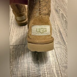 The product is a pair of UGG Classic II Glitter Leopard boots in size 6 for girls. These brown boots feature a stylish leopard print design with glitter accents, adding a touch of sparkle to the classic UGG style. The UGG brand is known for its high-quality materials and comfortable footwear, making these boots a fashionable and practical choice for young girls.