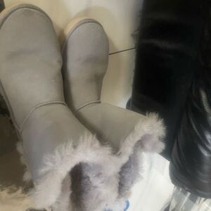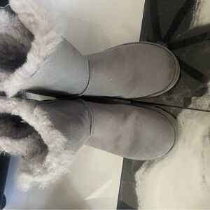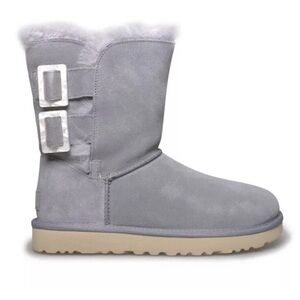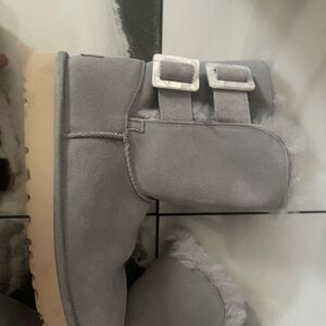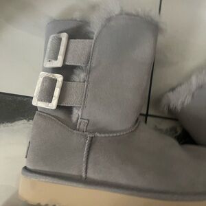 Stylish UGG ankle boots. Soft gray exterior. Cozy interior lining. Cream sole for contrast. Double buckle detail.