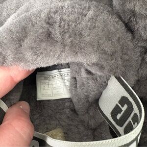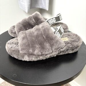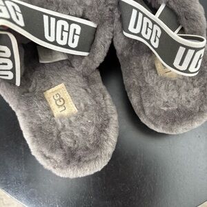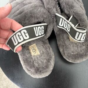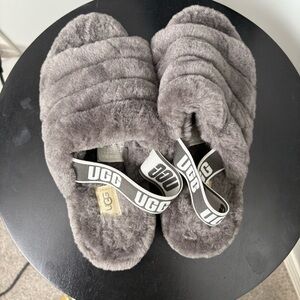 Cozy gray fluffy slippers with UGG logo strap. Perfect for lounging. Minimal wear. Size 9.