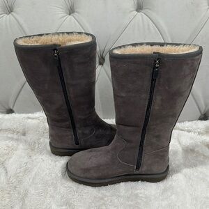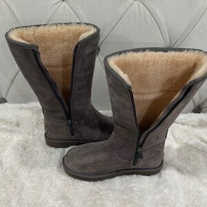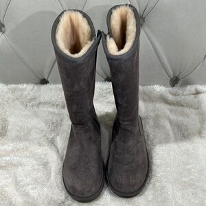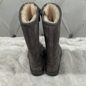 Experience ultimate comfort and warmth with these UGG winter and rain boots. Crafted in a stylish gray hue, they feature a plush interior lining and a durable rubber sole for excellent grip. Perfect for cold weather, these boots offer a classic design ideal for casual outings.