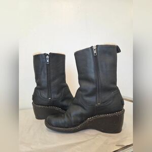Excellent high quality UGG boots with sheepskin leather outer and sherpa lined inner. Wedge Heels with inner side zip closure. Overall in very good preowned condition. The leather is supple and smooth, some very very minor scuffs near the toes. hardly noticeable. There are some spots on the wedge heels, see all photos. Womens size 8.