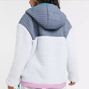“Soft, sporty, and always in style, this hooded half-zip pullover is made from cozy sherpa and logo-embellished quilted nylon for varied texture and an unparalleled wearing experience. Featuring convenient kangaroo pockets lined in fleece to keep the heat in your hands, it's finished with stylish contrast colors, additional hidden pockets, and a drawcord-adjusted hem for the perfect fit.”