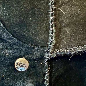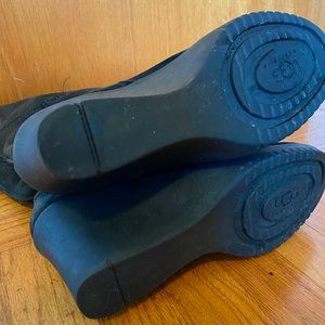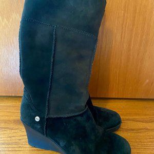 Ugg suede and shearling tall boots with a 3" wedge heel. The style is "Joslyn" and the color is black. They are a size 9 and fit TTS. They can be worn tall or folded to show off the shearling. These are in excellent, lightly worn condition. Real shearling and suede!