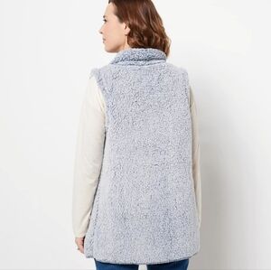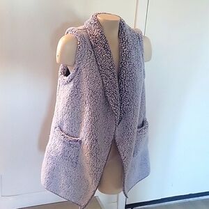 Keywords: sherpa vest, hooded vest, sleeveless vest, open front vest, fleece vest, cozy vest, comfy vest, layering vest, casual vest, winter vest, fall vest, pockets, gray vest