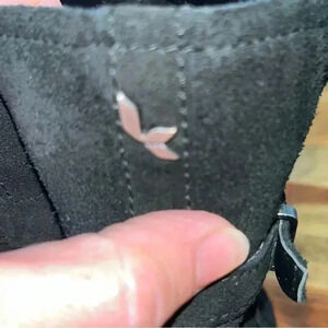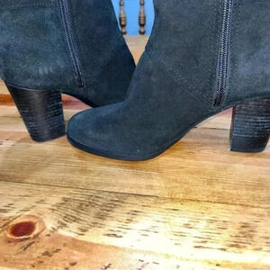 Stacked heel boot with side zip decorative grommet and buckle detail.  Suede with Ortholite comfort foam insoles.