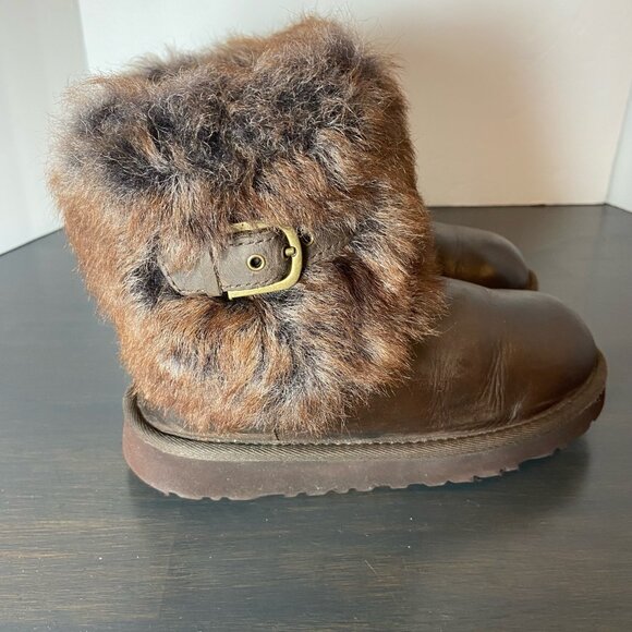 UGG Kensington Leather Fur Cuff Buckle Boots Brown Youth 2