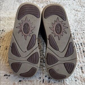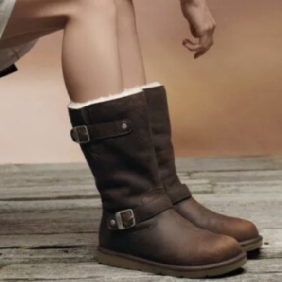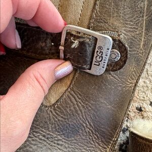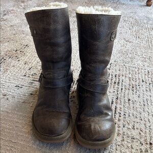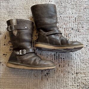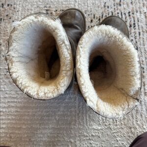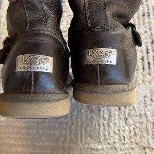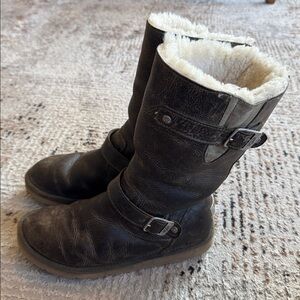 Cozy UGG boots with soft cream lining. Adjustable straps, superior traction, and the cozy sheepskin interior deliver serious weather protection in style. Item No. 5678. Size 9 in good used condition. One of the buckles has a threads that’s loose-see pics. Please let me know if you have any questions!