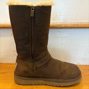 These are UGG Kensington mid-calf zip boots for girls. Chunky with rough brown leather, buckles, and sheepskin interior. Super warm + stylish. Girls size 3 youth and in excellent used condition.