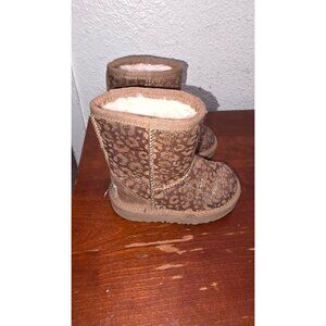 UGG Kids Tan Glitter Leopard Print Boots Shearling Lining Size 6