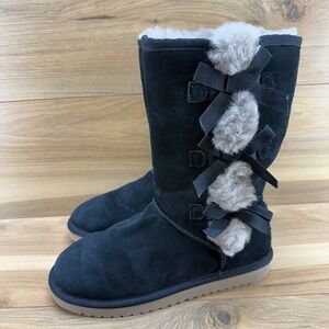 UGG Koolaburra Victoria Bow Tall Boots Womens 8 Black Suede Shearling Fur Lined