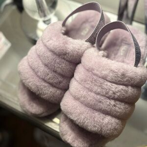 Chic UGG slippers with plush texture. Adorned with a rhinestone strap for added sparkle.